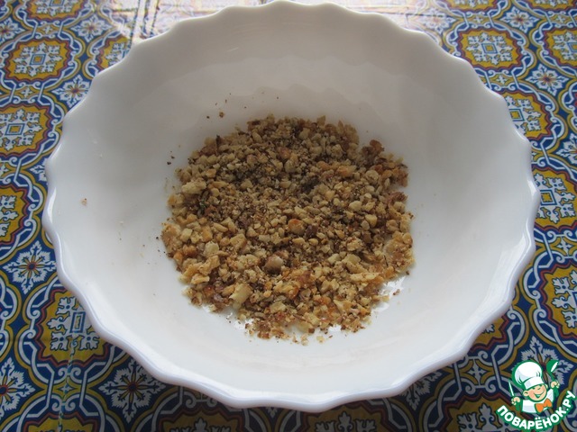 Смешать фасоль, оливки, орех и лук. Посолить, заправить оливковым маслом, добавить измельченный чеснок, порезанную петрушку. Перемешать.
