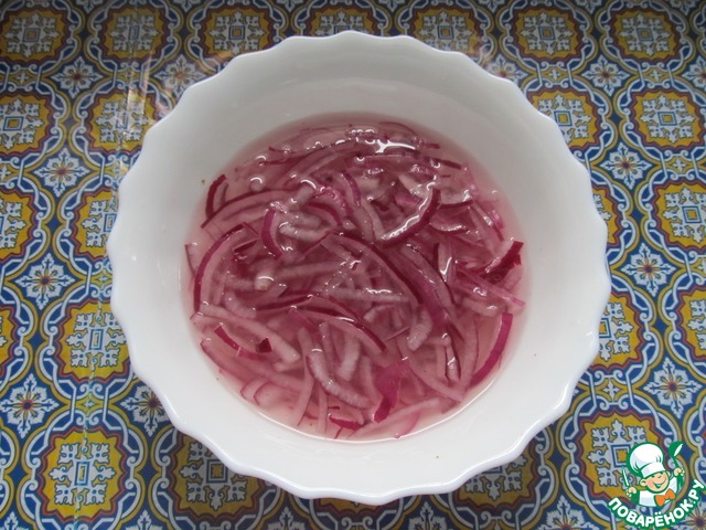 Лук нарезать полукольцами. Добавить сахар, яблочный уксус и 100 мл воды. оставить мариноваться на 15 минут. Слить воду.