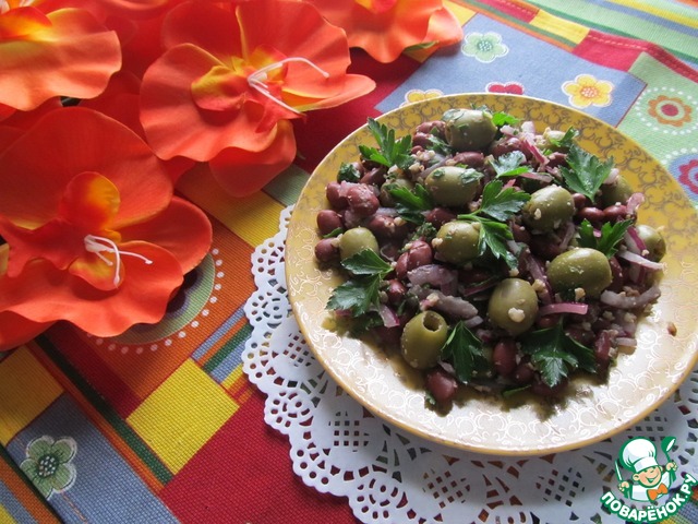 Оливки и фасоль "Лобио по-грузински ТМ Фрау Марта" - самостоятельные блюда, которые можно съесть, что называется "в один присест". А вместе в салате получается быстро, вкусно и красиво. Попробуйте!