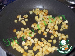 Картофель чистим, нарезаем мелкими куриками и обжариваем в небольшом количестве масла до золотистой корочки, немного посолив, поперчив и приправив мускатным орехом.