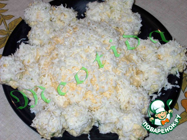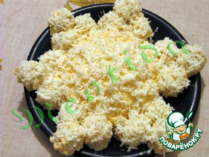 Трем на мелкой терке белки и сыр, сыр смешиваем с майонезом и измельченными 2 зубчиками чесночка, покрываем 1/3 сырно-майонезной массы центральный кружочек снежинки.