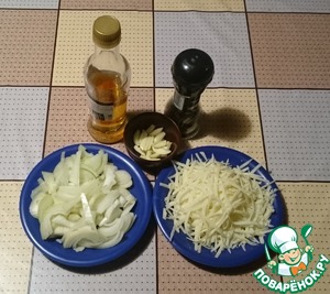 Чеснок нарезаем вдоль на небольшие кусочки, лук - полукольцами.