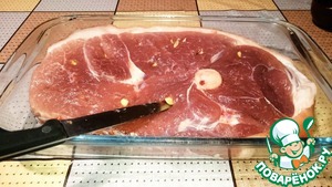 Небольшой совет. Мясо прокалываем ножом не сверху-вниз, а под углом. Волокна лучше разрезаются и кусочек чеснока удобнее "запихнуть", не выскакивает.