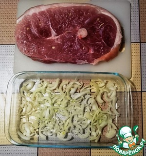 На дно формы, в которой будем запекать мясо, кладём лук. -