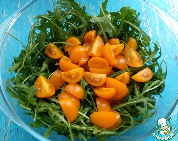 Рукколу промыть, выложить на полотенце, чтобы избавиться от лишней воды. Далее переложить в салатник.