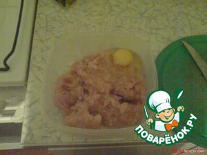 Берм 500 г. куриного фарша, солим по вкусу, вбиваем 1 яйцо. Все ингредиенты тщательно перемешиваем.