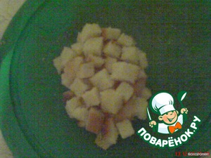 3. Из фарша формируем небольшие котлетки и обваливаем их в батоне, который заранее порезали небольшими кубиками.