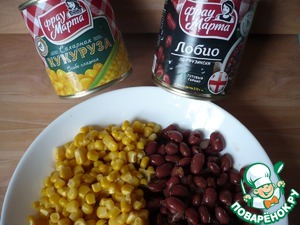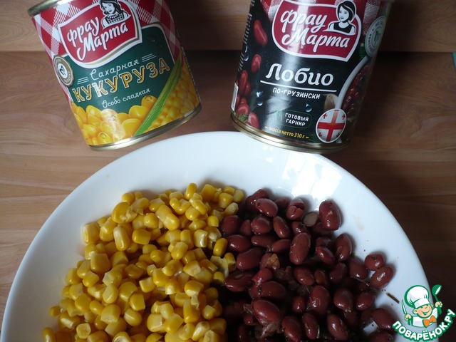 Для приготовления салата я взяла красную фасоль лобио по-грузински ТМ "Фрау Марта" и консервированную кукурузу ТМ "Фрау Марта" ( без жидкости).
