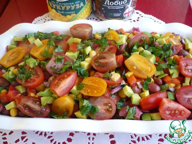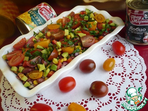 Салат с консервированной красной фасолью лобио по грузински ТМ Фрау Марта и консервированной кукурузой ТМ Фрау Марта – это вкусное и сытное блюдо. Красная фасоль лобио по-грузински - это уже готовый гарнир, но в сочетании с консервированной кукурузой и другими овощами, они очень удачно дополняют друг друга и идеальны для салата.