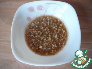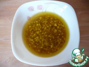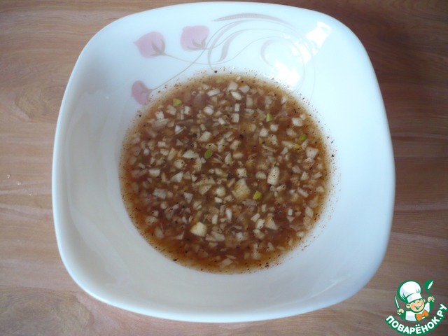 Сначала приготовим заправку для салата: раздавите зубчик чеснока и посыпьте щепоткой соли. Затем смешайте в миске чеснок, сок лимона и перец чили.