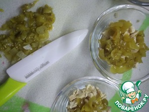 Соленые ( маринованные) огурцы нарезать кубиками.