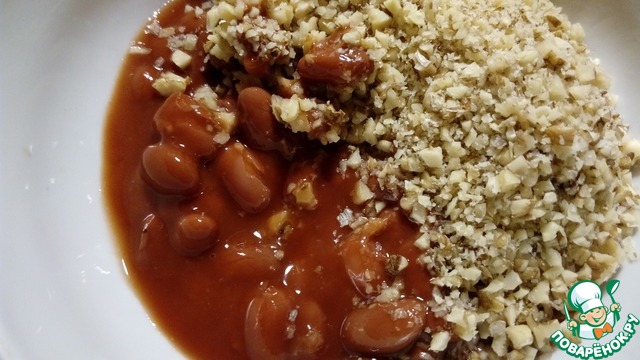Смешать орехи с фасолью в томатном соусе. У меня фасоль ТМ "Фрау Марта", очень вкусная.