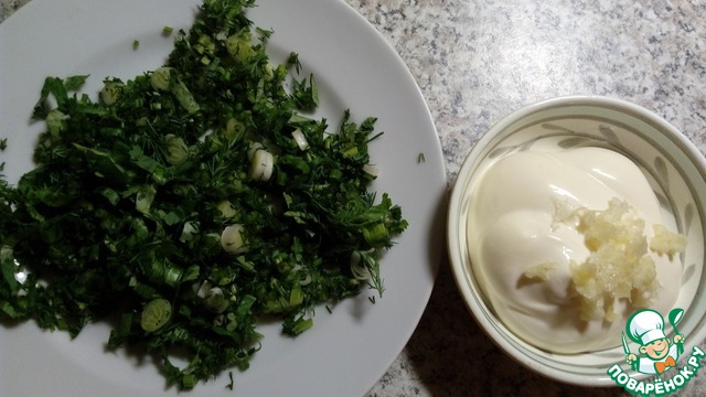 Зелень порезать, в майонез выдавить дольку чеснока.