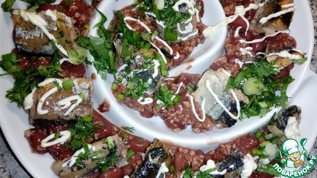 На тарелку выложить смесь фасоли и орехов, сверху кусочки рыбы. Посыпать орехами и зеленью, полить майонезом.