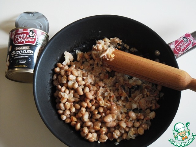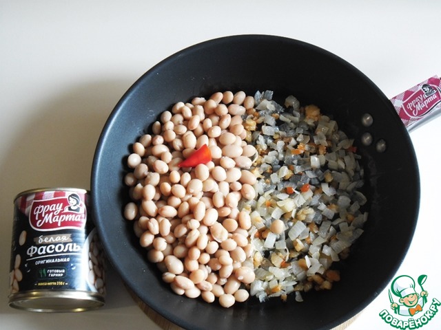 обжарить на нем лук, слегка посолить, ЩЕДРО поперчить нарубленным перцем чили и добавить предварительно отваренную фасоль.