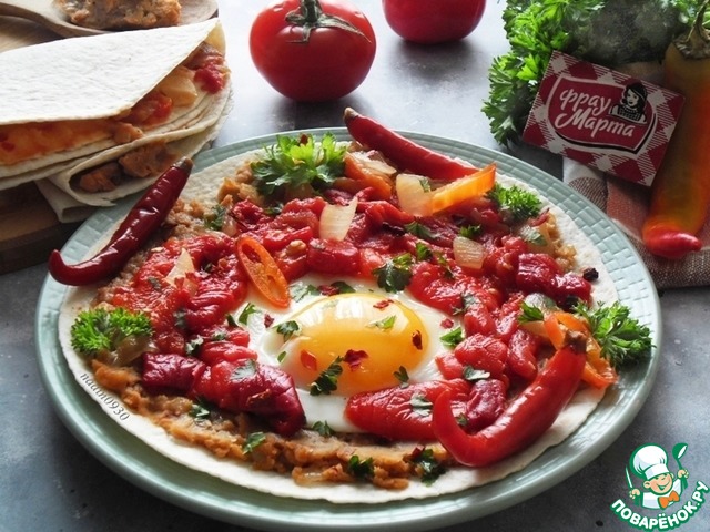 В Мексике это блюдо называют "уэвос-ранчерос" - яичница по-деревенски, и подают с фасолевой пастой на лепешках - tortillas. Такой завтрак зарядит вас энергией на весь день. Да и в обед такое блюдо, поданное с пылу с жару, будет отличным вторым. И я не сомневаюсь в том, что сколько в Мексике ранчо, столько и вариантов этого блюда. Вот одно из них. Присоединяйтесь, удивляйте любимых!