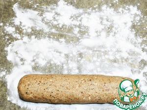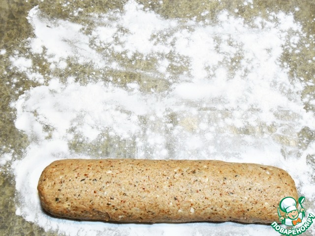 А в это время достаём тесто из холодильника. На подпыленном мукой столе формируем валик,