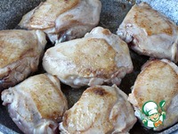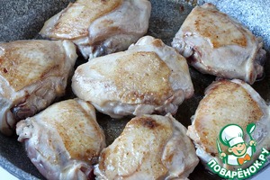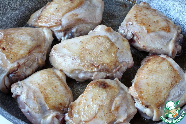 Куриные бедра очистить от лишнего жира, посолить и обжарить на среднем огне с двух сторон.