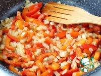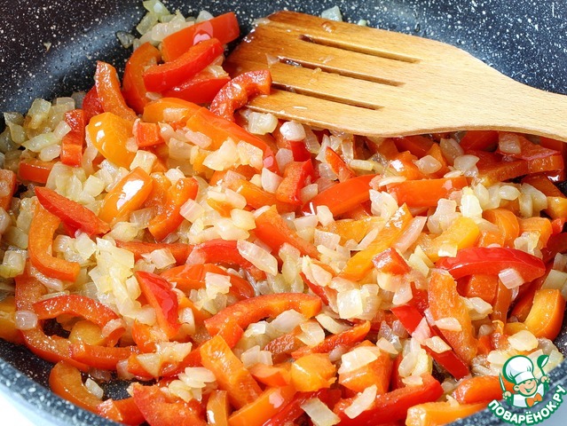 Репчатый лук нарезать мелким кубиком, обжарить с добавлением растительного масла до полуготовности. Болгарский перец нарезать соломкой, добавить к репчатому луку, приправить копченой паприкой и жарить на небольшом огне до полуготовности перца.