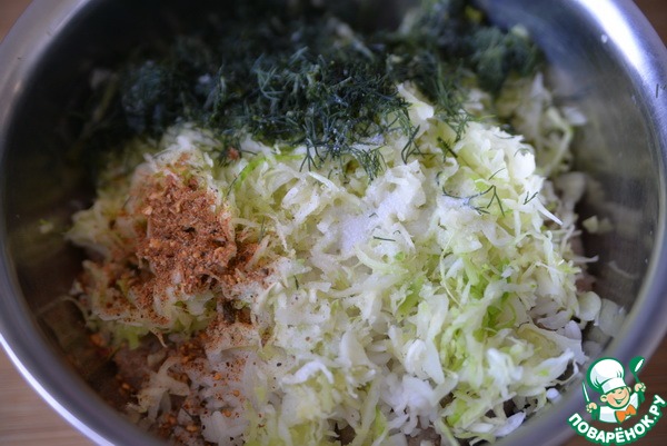 Откидываем капусту на дуршлаг, отжимаем, кладём к фаршу. Жидкость от капусты оставляем.