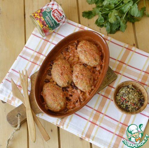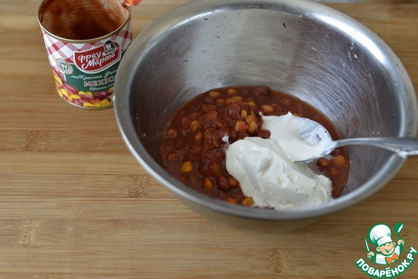 Для заливки берём консервированную фасоль в томате. У меня красная "Мехико". В её составе также кукуруза и болгарский перец.