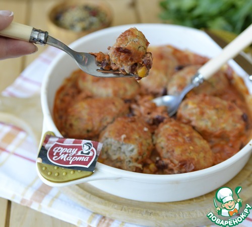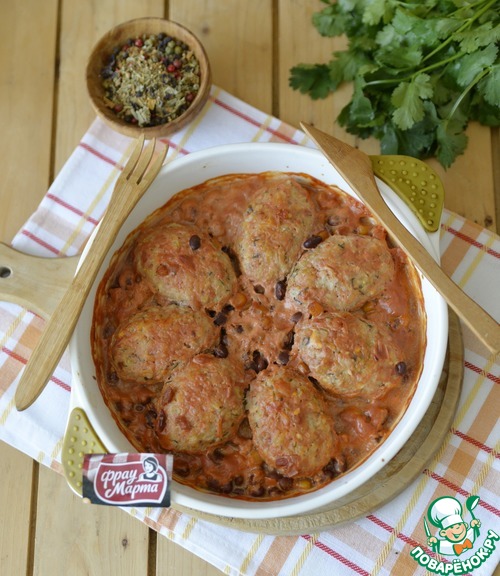 Делаем из фарша небольшие котлеты. Кладём котлеты в форму, в которой будем запекать.