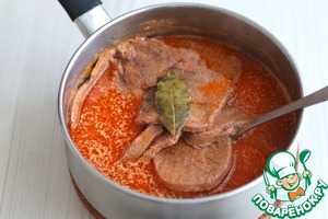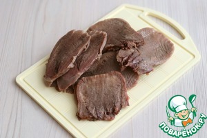 Говяжий язык отварить в подсоленной воде до говности. Далее язык вынуть из бульона, нарезать на пластики, отставить в сторону. |