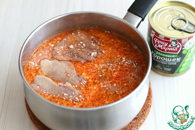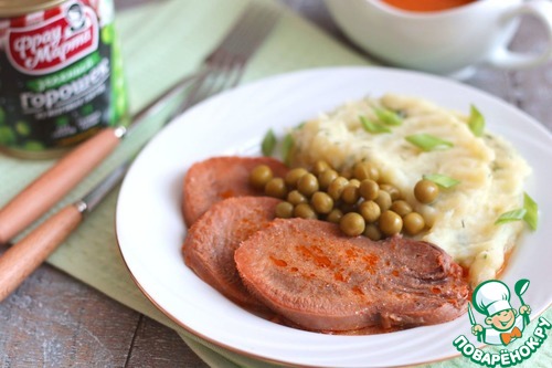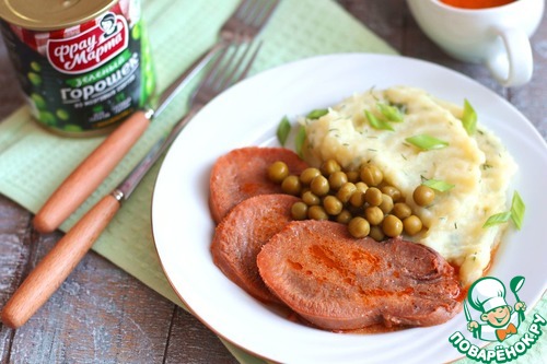 К языку под соусом подать сложный гарнир: картофельное пюре и консервированный горошек ТМ "Фрау Марта". Приятного аппетита! |