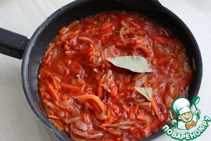 В сковороду с пассерованными овощами (морковь и лук) добавить сместь томатной пасты и пряностей.