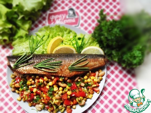 Осталось подать овощной гарнир с рыбой и зеленью.