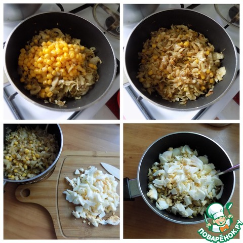Капусту обжариваем (не сильно) до готовности. Солим по вкусу. Можете даже поперчить, если не будут есть дети. К готовой капусте выкладываем кукурузу, перемешиваем. Готовим ещё минут 5 и снимаем с огня. Яйца нужно сварить вкрутую. Порубим яйца и добавим к капусте. Перемешиваем. Начинка готова. Ароматная и вкусная.