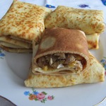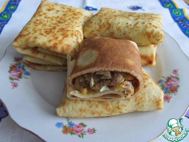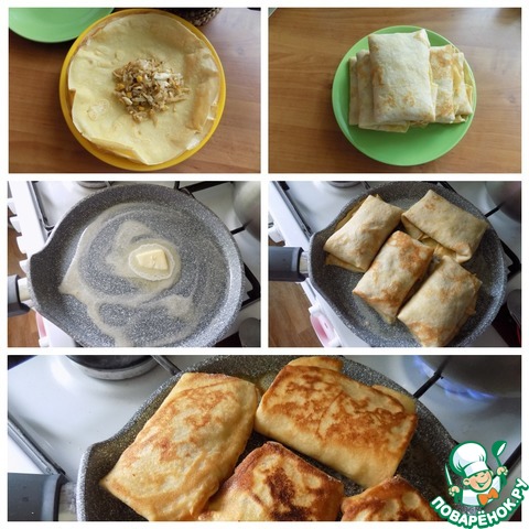 Я блины заверну конвертиком. Блины большие по диаметру, начинки поместится много. Сворачиваем блины. Количества этой начинки мне хватило ровно на эти 7 блинов D-24 см. В принципе, вот для меня блины уже готовы к употреблению. Это для тех, кто не ест жареной еды или ест совсем мало. Но я сегодня блины обжарю для подачи на сливочном масле до красивой хрустящей корочки. Обжарить нужно столько блинов, сколько съедите за раз. Я обжарила 4 шт.