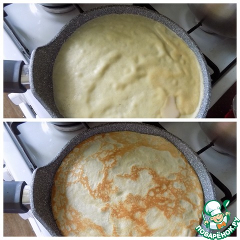 Тесто готово. Выпекаем блины. Сковорода D-24 см. Греем её и для первого блина сковороду можно подмазать немного. Всё-таки блины будут очень тонкими. Разливаем тесто тонким слоем по всей поверхности сковороды. Обжариваем блин с одной стороны до красивого цвета и когда он схватится, переворачиваем и дожариваем до готовности с другой стороны. Блины тонкие и жарятся очень быстро.