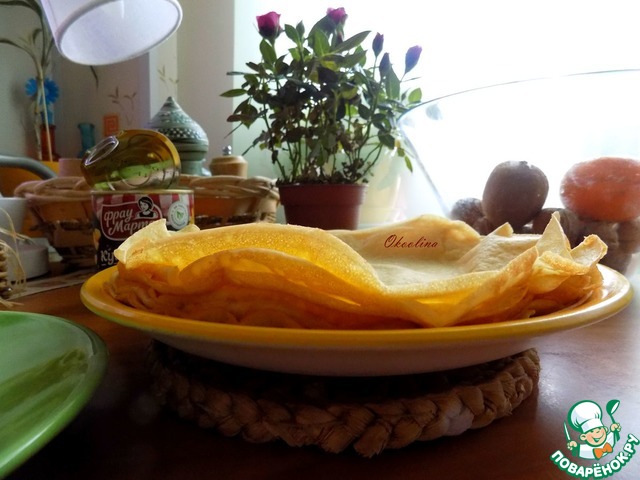 Снимаем блин на тарелку и сразу их накрываем крышкой. Я использую колпак для СВЧ. Это для того, чтобы краешки блина не подсохли и блин хорошо завернётся, не ломаясь. Из этого количества теста получилось 7 шт очень тонких блинов D-24 см. Вот такие красавчики.