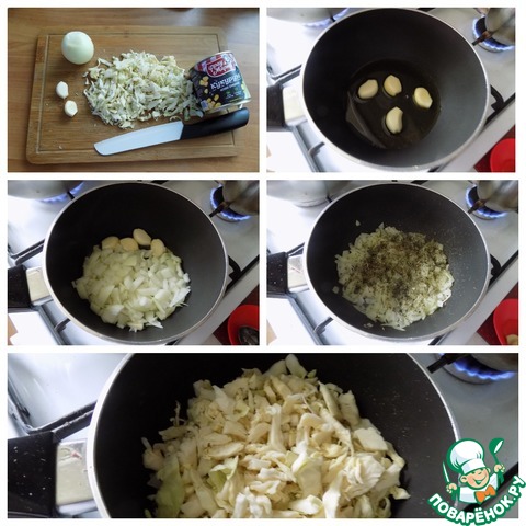 Делаем начинку. Капусту шинкуем мелко. Чеснок режем пополам поперёк и отправляем на разогретое масло оливковое в сотейнике или сковороде. Держим чеснок с минуту, чтобы он отдал свой аромат маслу, выкладываем лук, порезанный произвольно и ещё через минуту чеснок убираем (выкидываем). Лук золотим, присыпаем его чабрецом (тимьян или орегано). Выкладываем к луку капусту.