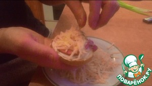 1. Намазать творожный сыр, положить огурец, колбасу, и тертый сыр
