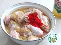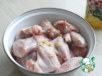 Через чесночный пресс пропустить чеснок (3 зуб.), чесночную кашицу добавить в миску с куриными крылышками. |