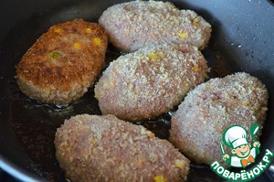 Масло разогреть в сковороде, обжарить котлеты с обеих сторон до румяной корочки. Минуты 3-4, огонь умеренный.
