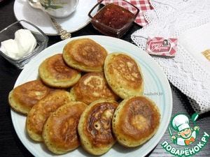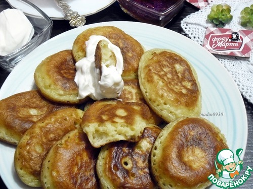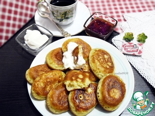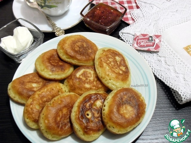 К оладушкам подать сметану, варенье, мед или сгущенное молоко.