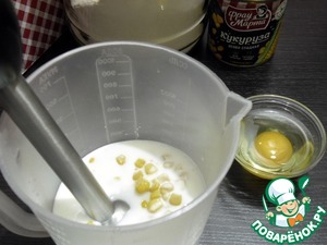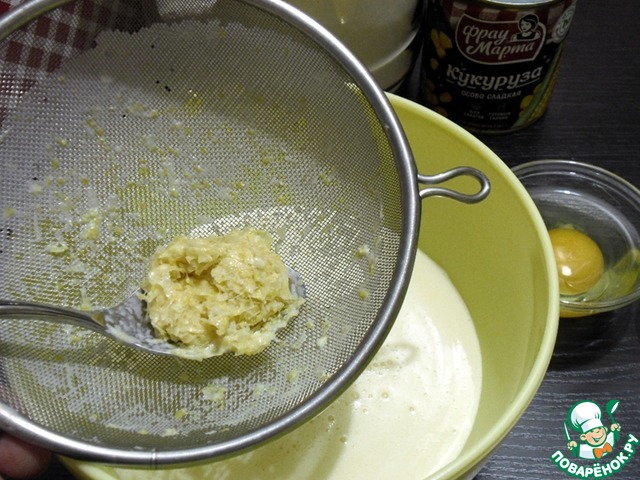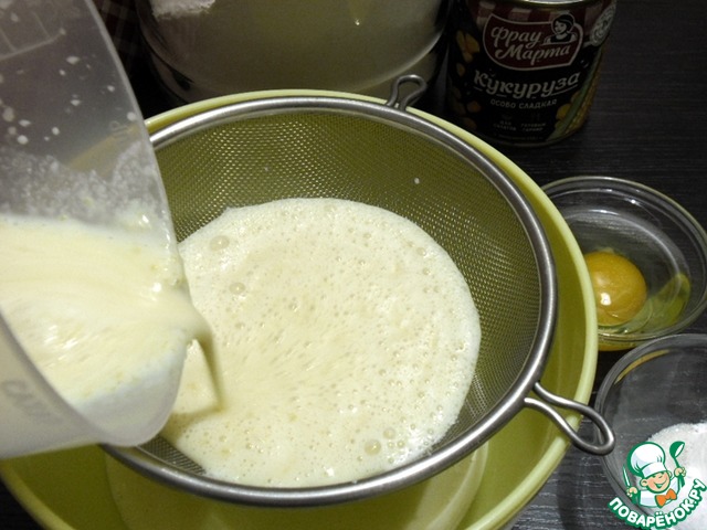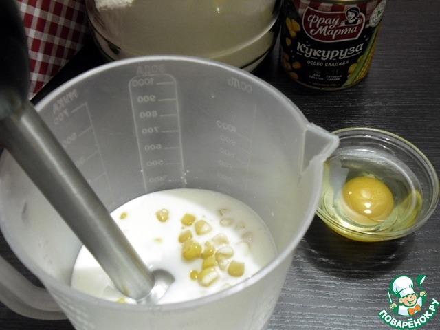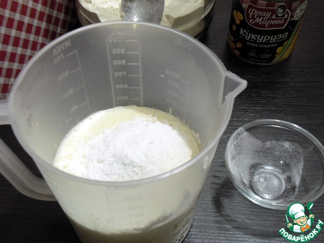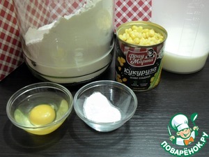 В кукурузно-кефирную жидкость добавить яйцо, просеянную муку, соль, сахар и разрыхлитель.