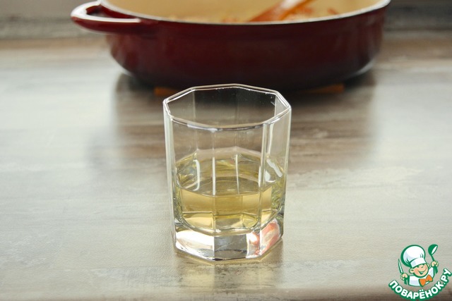• Влейте в сотейник к рису сухое белое вино. Готовьте, помешивая, пока всё вино не впитается в рис. Алкоголь испарится, от вина должен остаться только аромат и лёгкое послевкусие