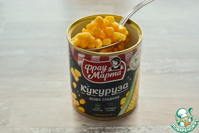 • Что касается кукурузы, то в идеале использовать свежую кукурузу молочной спелости, срезанную с початка. Но сейчас не сезон, и взять её негде. Поэтому можно использовать сахарную консервированную кукурузу ТМ "Фрау Марта". Она очень нежная и сладкая, идеально вписывается в это блюдо
