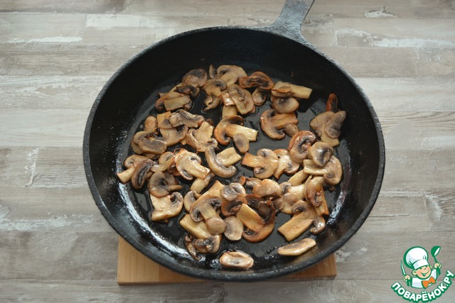 • Шампиньоны нарежьте пластинками и поджарьте с добавлением 1 ложки оливкового и 1 ложки сливочного масла. Пока отставьте в сторонку, несколько грибов оставьте для украшения.