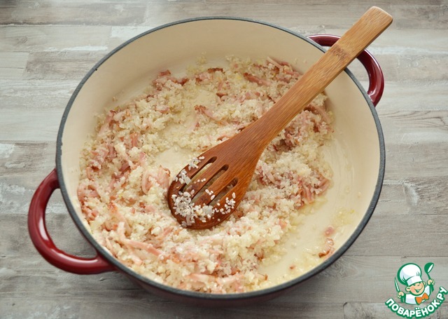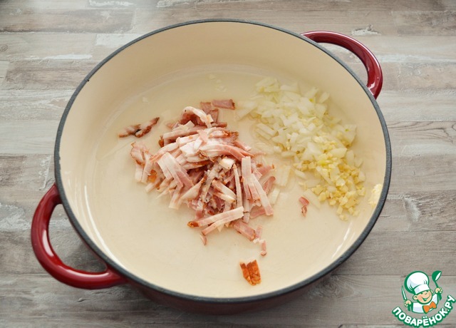 • В толстостенном сотейнике разогрейте 1 ложку оливкового и 1 ложку сливочного масла. Слегка поджарьте нарезанную копченую грудинку, мелко нарезанный лук и чеснок. Огонь поддерживайте средний. Готовьте до прозрачности лука, ни в коем случае не доводя до коричневого цвета.