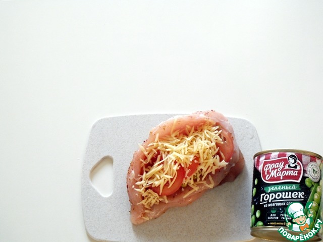 У филе сделать надрез вдоль, в виде карманчика. Во внутрь "кармашка" сбрызнуть соком из половины мандарина, всыпать немного соли и специй, растереть. Распределить по всей внутренности зеленый горошек, разложить чеснок и колечко острого перца (перец по желанию). В данном случае филе было толстенькое, и я сделала два параллельных надреза, распределив начинку на два слоя.