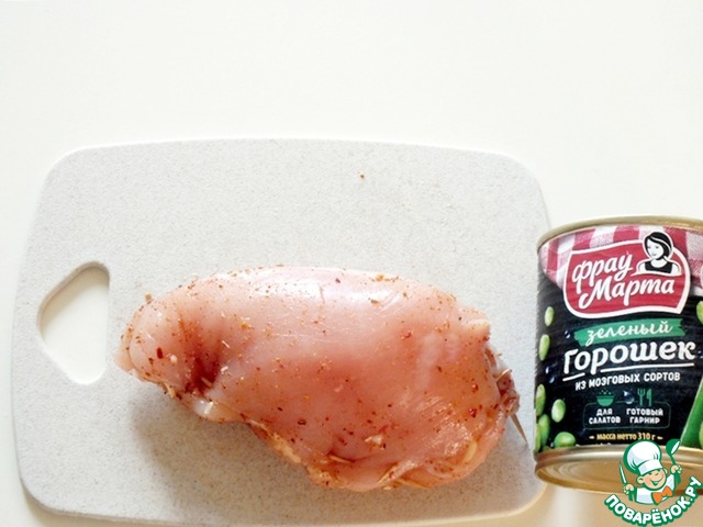 Зеленый горошек консервированный откинуть на дуршлаг, хорошо стряхнуть с него жидкость. В рецепте использован консервированный зеленый горошек от ТМ Фрау Марта. Нежный и вкусный горошек.