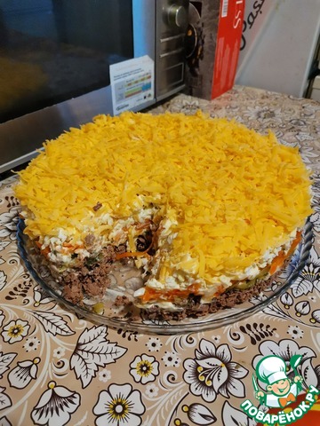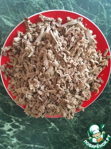 1 Слой: Промыть и отварить печень в подсоленной воде. Натереть на крупной терке. Смазать майонезом.
