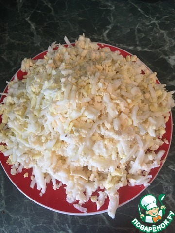 4 Слой: Натереть отваренные яйца на крупной терке. Майонез.