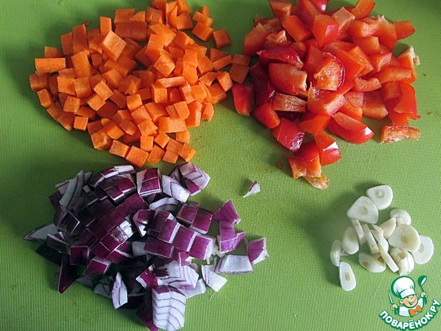Лук, морковь, перец нарезаем кубиками, чеснок - ломтиками.