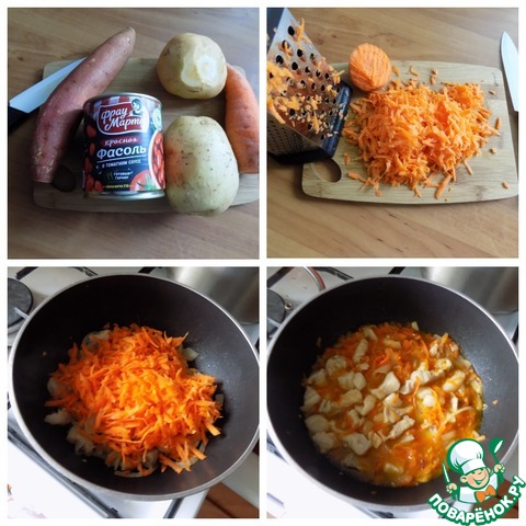 Батат, репу и картофель очистила от кожицы. Нарезала все овощи небольшим кубиком. Первым в сотейник отправила картофель. Потушила его 10 минут. Далее выложила репу и батат. Этим овощам хватит минут 10-15, чтобы дойти до готовности. Потушила овощи до готовности и положила фасоль в томатном соусе целую банку.